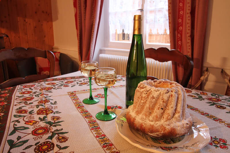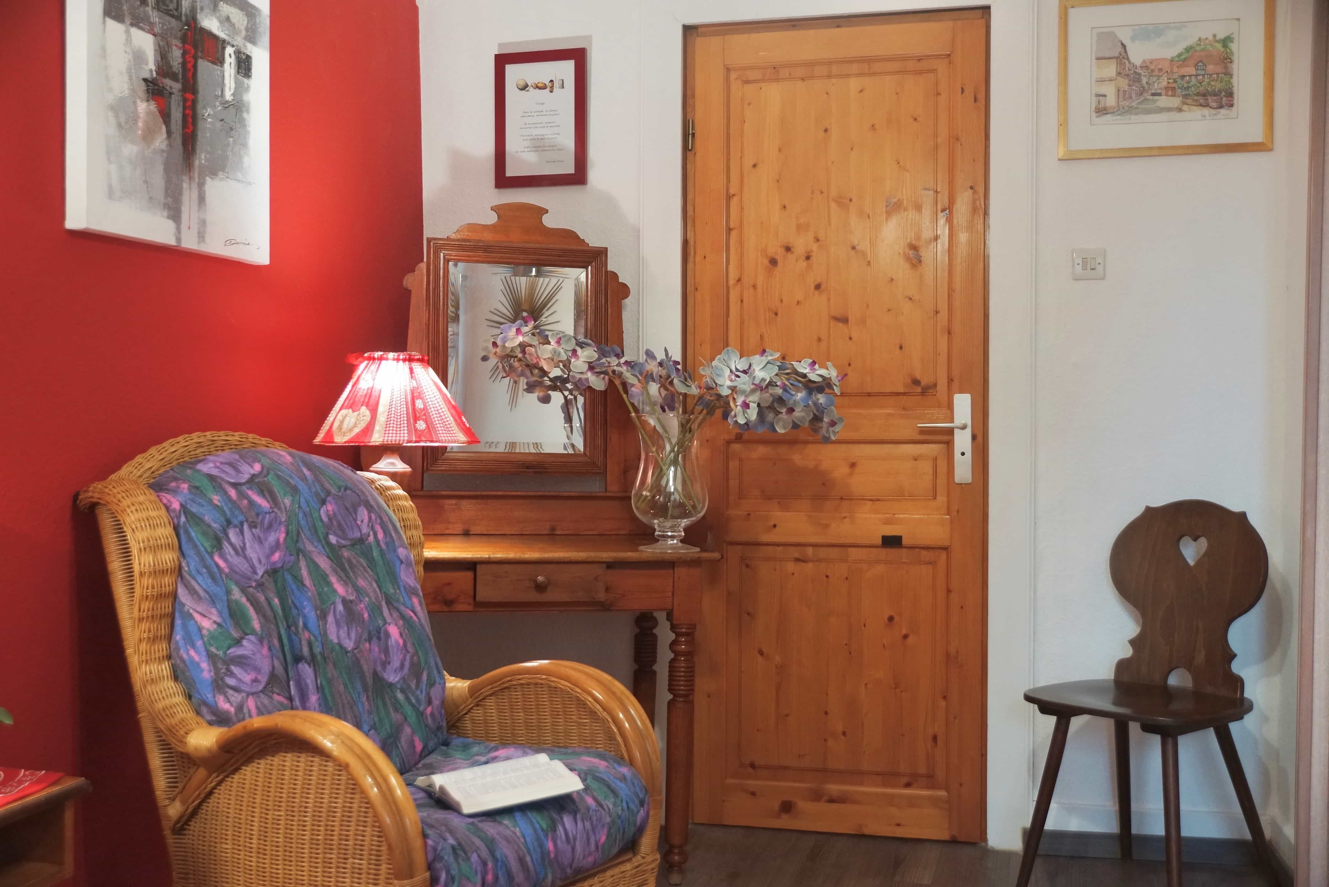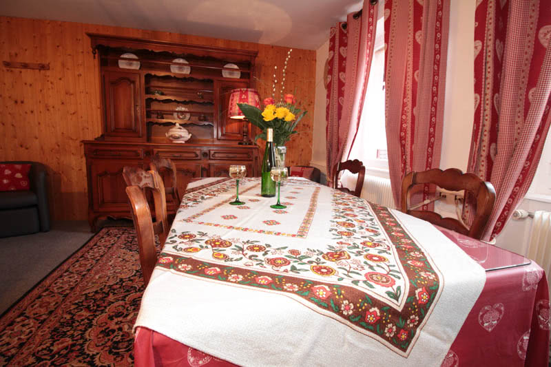 un séjour, privatif, très lumineux avec canapé-divan, mobilier alsacien, table pour 6 personnes, chaises, fauteuil…