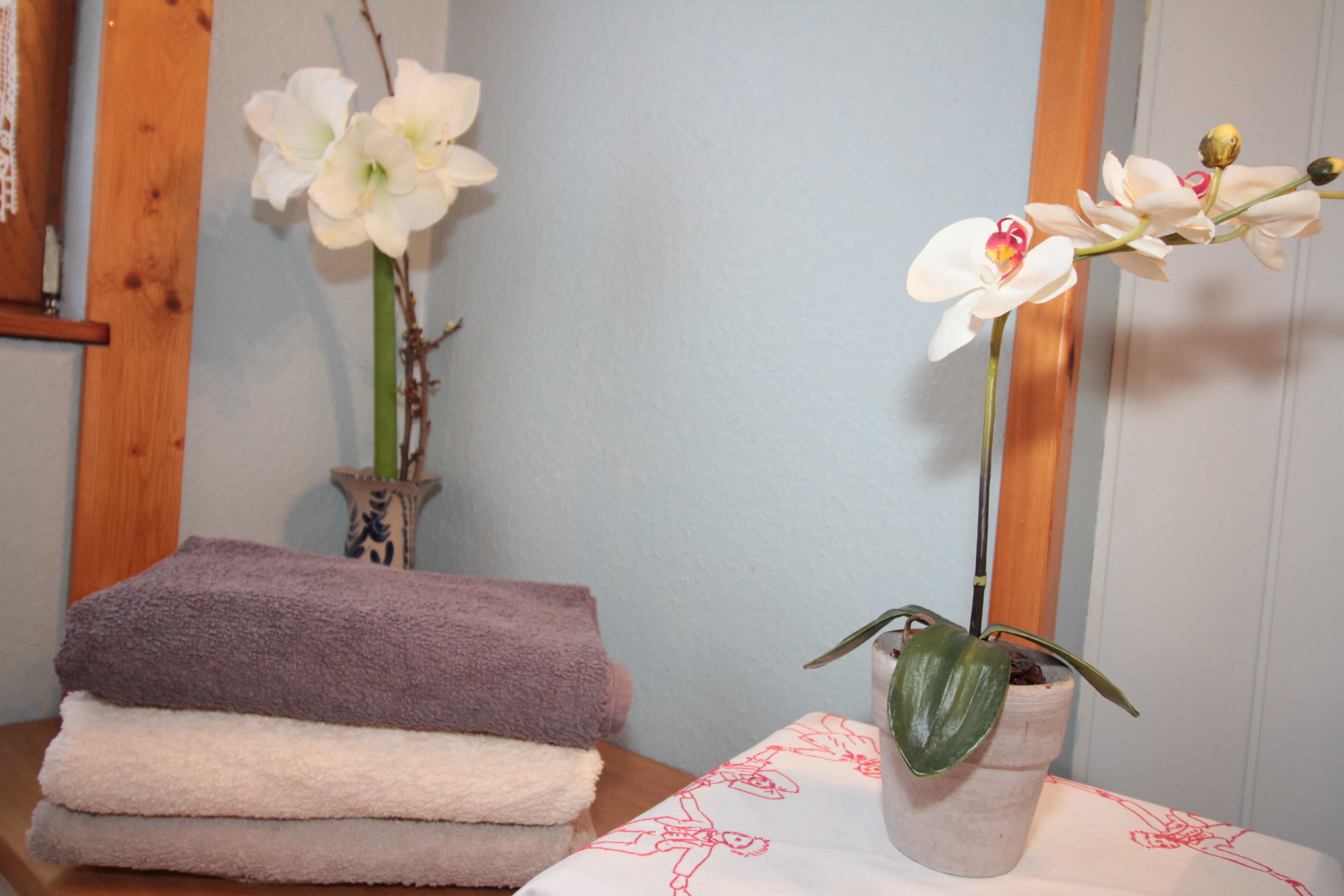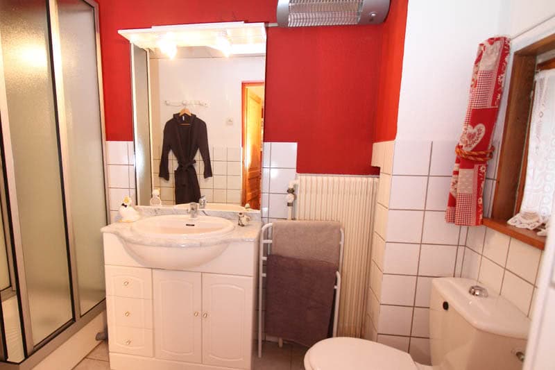 Le logement est également agrémenté d’une salle d’eau, privative, carrelée, avec douche (sèche-cheveux et miroir grossissant sur pied, à disposition). Lave-linge possible.